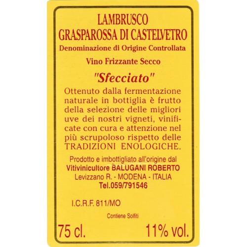 Lo "Sfecciato", Lambrusco Grasparossa di Castelvetro D.O.C., nasce dalle migliori uve dei nostri vigneti, sulle colline di Castelvetro di Modena. È un vino intenso e piacevole, perfetto per tutti coloro che desiderano degustare un prodotto ricercato. La stagionatura, che dura circa un anno, contribuisce a fare dello Sfecciato un vino assai raro nel panorama dei Lambruschi.