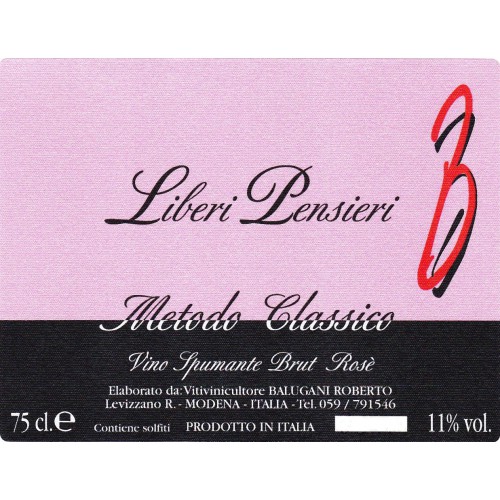 "Liberi Pensieri" è uno Spumante Rosè ottenuto da uve di nostra produzione unicamente dal vitigno Lambrusco Grasparossa di Castelvetro. Viene preparato secondo il “Metodo Classico” dopo una stagionatura di due anni.